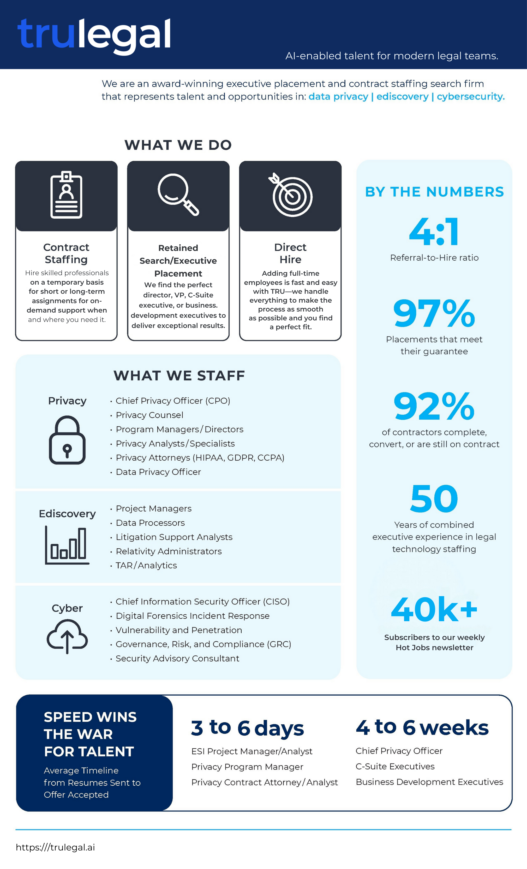 Get your copy of TruLegal's "Expand Your Business Potential with Expert Privacy Contractors." Learn everything you need to know to accelerate your privacy program — from up-to-the-minute, exclusive market metrics, tips to win the best talent, insights from leading privacy talent agents, tips for building an agile privacy team, and more critical insights for staying ahead of the competition.